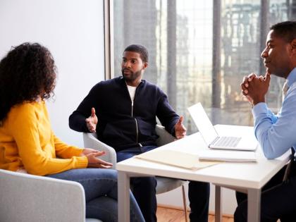 A Rose Gardens resident engages Training and Employment Lead Kelly Griffith during the feedback session at the Rose Gardens Community Town Hall, organised by Project STAR.
